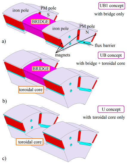 2. The U-shape with Bridges (UB) concept (Figure 2b) with six axial flux bridges including the toroidal rotor core, as shown in Figure 1a;