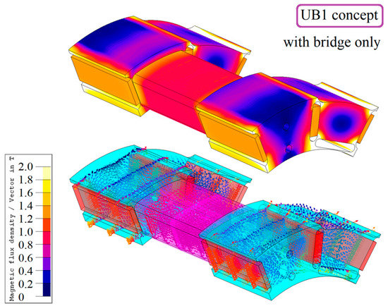 As mentioned above, the target of the study was to demonstrate the influence of axial magnetic bridges in magnetic circuit of the hybrid excited machine on field-weakening and -strengthening features and iron loss distribution. For this, the 3D-FEA was used. Due to the rotational symmetry of magnetic flux distribution in the considered machine and in order to reduce the calculation cost, a FEA model of the machine was limited to one-sixth of the machine structure. Figure 3 shows the magnetic flux distribution in the UB1 rotor concept of the ECPMS machine performed by using the Flux3D software package (Version 10.4) developed by Cedrat, Ltd. (Meylan, France).