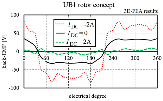 According to these results, by using the rotor structure based on the U idea, the ECPMS machine with perfect field-weakening capability can be build. The results proved that the stator flux linkage can be decreased by at least five times. The effect was clearly observed in all presented concepts. As a consequence, the back electromotive force (back-EMF) waveforms can be adjusted successfully using DC field excitation, even in the machine with a UB1 rotor concept, as shown in Figure 5.