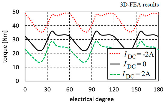 Additionally, FE analysis of the electromagnetic torque ripple (Figure 6) and cogging torque (Figure 7) at different DC field excitations has been carried out.