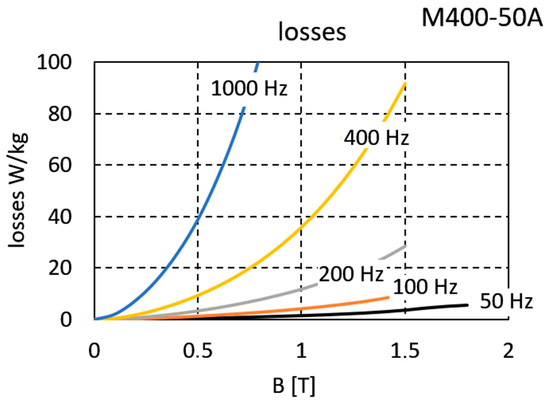 In the proposed structures of the machine, a rotor core and a stator core with the axial bridges were made of laminated iron (sheet type M400-50A with a thickness of 0.5 mm) with losses and a B–H curve presented in Figure 8 and Figure 9. The shaft is made of a solid nonmagnetic material. Moreover, the PMs type N38SH (ENES Magnesy LP, Warsaw, Poland) used in this study have a remnant flux density of 1.23 T and a coercive force of 907 kA/m.