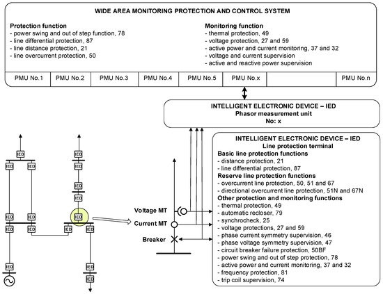 Intelligent electronic devices (IED), which are used for relay protection, have many functions [18], including protection and monitoring functions. These functions are standardized and widely used in transmission network protection systems. Line protection terminals are multifunctional devices with basic and reserve protection and monitoring function that are used in transmission line protection systems, as shown on Figure 1. The numbers adjacent to the different function represent their identifier in accordance with the standard [18]. In the field of relay protection the numbers are used to simply enumerate and list all the available functions. Therefore, they are commonly found in SCADA and protection systems.