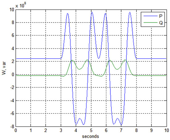 Voltage magnitude decreased to almost to zero kV for a transmission line where the out-of-step condition manifested (Figure 4a) and current values surpassed the nominal values by a large margin (Figure 4b). In parallel, intense power oscillations are also present as can be seen from the Figure 5, where the difference compared to stationary state (before second 3 when out-of-step condition occurs) is significantly different.