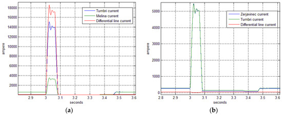Values for line currents and line differential currents on two adjacent transmission lines: (a) Short circuit fault on Tumbri-Melina line with currents from both side of line with differential current ΔI; (b) Tumbri-Zerjavinec line with fault current and differential current ΔI.