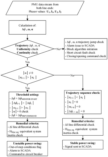Flow chart of the algorithm for active power oscillations and out-of-step condition detection and early warning issuing.
