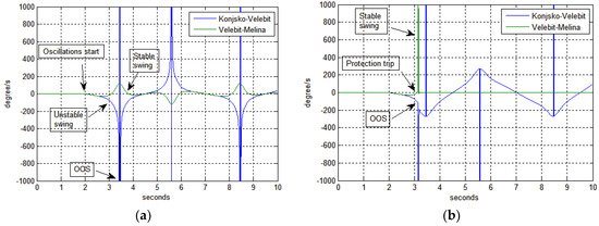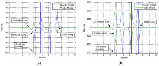 Through simulation, it was shown that besides angle difference other angle values should be traced and monitored in order to correctly detect the disturbance. Those values are angle speed (ω) and angle acceleration (α). Line with out-of-step condition (Figure 11—blue line Konjsko-Velebit) has significantly higher angle speed ω then other lines where only power swings manifests (Figure 11—green line Velebit-Melina).