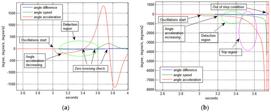 Details for power swing condition and out-of-step conditions on 400 kV line: (a) Details of the voltage angle difference Δφ, angle speed ω and angle acceleration α, on 400 kV transmission line with stable swing condition; (b) Details of the voltage angle difference Δφ, angle speed ω and angle acceleration α, on 400 kV transmission line with out-of-step conditions.