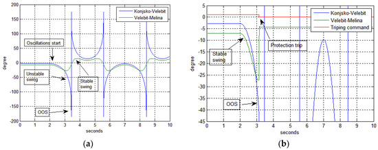 Active power oscillations on two 400 kV lines with voltage angle difference Δφ and protection operations: (a) On line Konjsko-Velebit there is an out-of-step (OOS) conditions and on line Velebit-Melina there is a power swing condition; and, (b) Detail presenting protection activations when protection setting is reached and tripped the Konjsko-Velebit line while Velebit-Melina remained in operation.