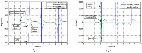 Angle difference, Δφ presents how power oscillations behave using the data of voltage angle from both sides of the transmission lines, Figure 10. Simulated disturbances in Matlab environment follow the characteristic pattern for stable and unstable swing [34]. The representative disturbance for out-of-step condition occurrence on the 400 kV transmission line Konjsko-Velebit was presented on the following figure (Figure 11). Neighboring 400 kV lines (e.g., Velebit-Melina) also manifested strong active power oscillations.