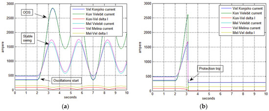 Remedial line protection criteria: (a) Konjsko-Velebit and Melina-Velebit currents from both line ends with differential current protection (ΔI). Out-of-step has developed on Konjsko-Velebit line and only stable power swing was present on Melina-Velebit line; (b) Konjsko-Velebit and Melina-Velebit transmission line current with protection operations.