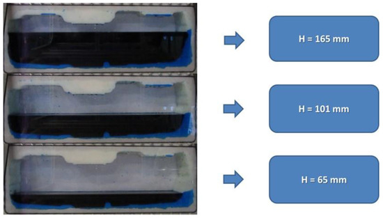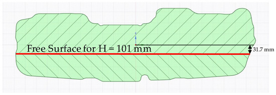 In Figure 7 the free surface in the tank drawing at H = 101 mm is presented. Each dimension has been taken with respect to the coordinate (0, 0, 0), center of the drawing. The bold red line in Figure 7 represents the considered free surface of one of the three analyzed cases.