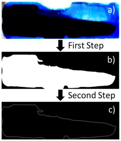 Experimental images described in the Section 2, as said, need to be post-processed to be comparable with results of the three-dimensional CFD model that will be described successively. For this reason, both experimental and numerical data have been compared after a picture enhancement treatment performed with Matlab®. Figure 3, as example, shows the experimental image before and after the post-process. In particular, Figure 3a is the image captured by the camera with enhanced contrast only while Figure 3b is the image after post-processing. The images after the post-processing phase consists of a sequence of steps. The initial image (i.e., Figure 3a) is uploaded in Matlab® where is cleansed of all parts not needed for analysis, as example the blue food coloring deposited on the first Plexiglas face visible in Figure 3a. Then the picture is turned into a black and white image as shown in Figure 3b. In particular, the liquid becomes white while the air is black. Then picture in Figure 3b is further post-processed in order to identifying the exact border between air and water for each condition. The final post-processed image is shown in Figure 3c.