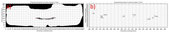 The last step of the post-processing process in Matlab® is presented in Figure 4, where for each time instant the center of gravity is correctly obtained [17]. Therefore, this evaluation has been done for each time instant in the range [7 ÷ 12] s with a time step of 0.25 s. Figure 4, in fact, shows the position of the center of gravity during tests step by step. In Section 5 of this paper, the experimental data and numerical results have been compared to estimate the accuracy of the simulation model on the free surfaces and the centers of gravity.