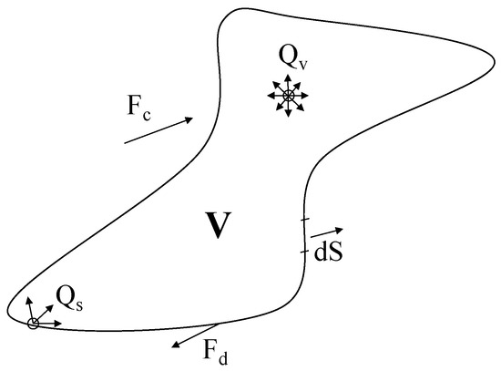 Considering a flow quantity and a control volume reported in Figure 5 [15,17,18,19], the Gauss’s theorem can be applied as reported into the equation: