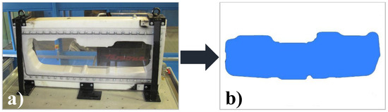 The experimental setup has been replied using a three-dimensional CFD numerical approach [15,21,22,23,24,25,26]. Therefore, starting from the real CAD geometry of the prototype tank, the fluid volume has been extracted and then meshed. The fluid volume of the tank is shown in Figure 6b. This volume has been extracted from the real fuel tank in Figure 6a.