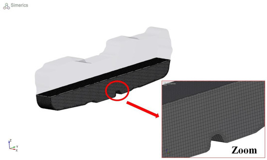 The entire grid of the tank fluid volume is shown in the Figure 8 with also a zoom view of the grid in a particular area around edges. With the described grid generation approach, it has been demonstrated [15] that it is possible to reach good accuracy and low computational time also by increasing the grid density in the boundary layer and on the surface. However, in case of multiphase simulation, it is better to have a mesh as uniform as possible. The zoomed view in Figure 8 shows that in this particular application the generated mesh almost is uniform, especially around edges. To better simulate the sloshing phenomenon, the grid has been subdivided and cut in the regions of high curvature and small details.