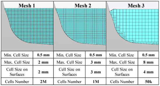 Figure 9 shows three of the generated meshes. The first grid called “Mesh 1” consists of 2 million cells. The maximum cell size and the cell size on surfaces have been set to 2 mm while the minimum cell size is of 0.5 mm. The grid called “Mesh 2” consists of 1 million cells with a maximum cell size and the cell size on surfaces set to 3 mm and with the same value of the “Mesh 1” for the minimum cell size. The grid called “Mesh 3” has only 50.000 cells. Also in this case the minimum cell size is of 0.5 mm while the other two parameters are higher than in other cases.