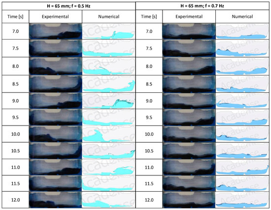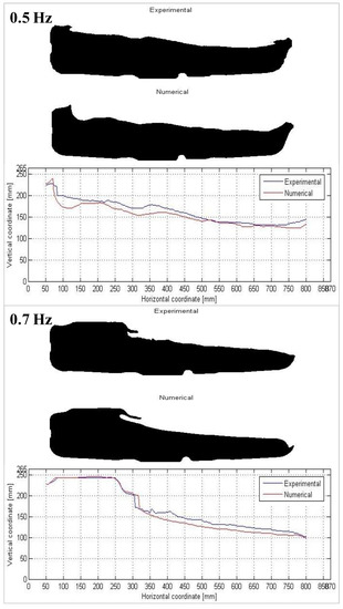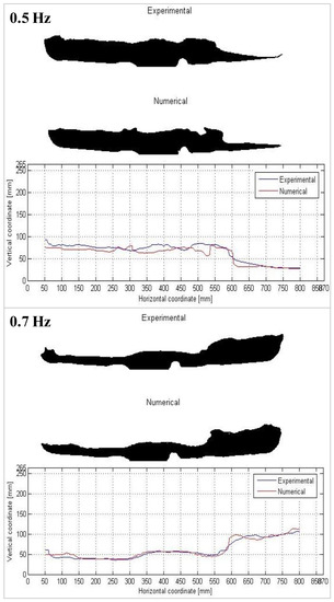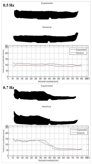 At the same way, the post-process phase has been done on the free surface of the fluid and the results are shown in Figure 17. Also in this case, the free surfaces and the comparison between numerical and experimental data have been analyzed.