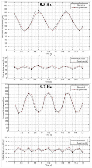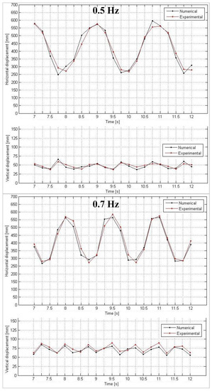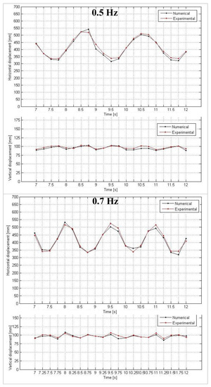 Even if the bench is able to obtain the rolling, pitching and yaw, in this paper the comparison between experimental and numerical data has been done only for the translation. Equations for the translation follow a harmonic law reported below, where the frequency is of 0.7 Hz and 0.5 Hz: