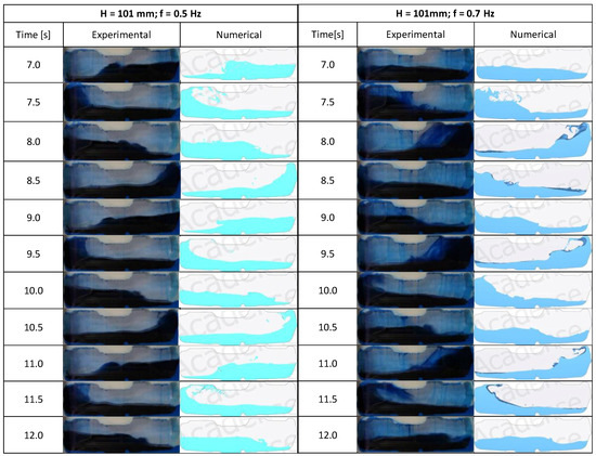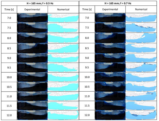 As done during tests, an assigned displacement along the direction y for the entire tank has been assigned as input for the model. The displacement law variation has been already shown in the paper Section 2 (Equation (1)). The displacement law variation is, therefore, function of the frequency (0.5 Hz and 0.7 Hz) and time. In order to replay the experimental data, simulations have been run for 17 s with 340 steps all saved for comparing numerical results with tests in the validation phase.