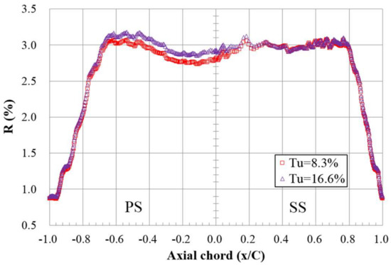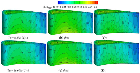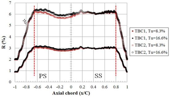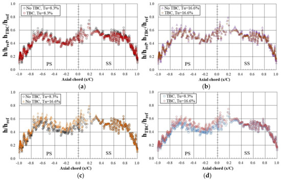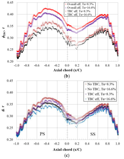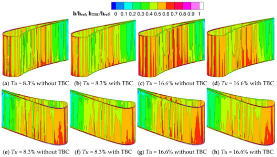 - When the level of Tu rises, the presence of TBC slightly dampens the heat transfer coefficient in general, and causes the lower augmentation of the heat transfer coefficient in the LE and its neighborhoods on the SS, as well as the region from the LE to the front of the TE on the PS.