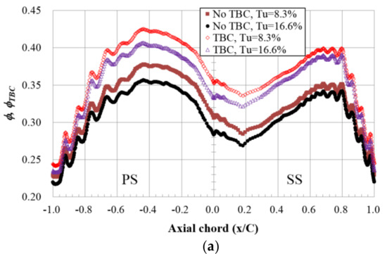 Figure 9 shows comparisons between φ, φTBC, and τ distributions at midspan for two Tus. At each Tu, it is clear that τ < φ < φTBC because T’ > T > TTBC. The trends of φ, φTBC, and τ distributions are similar to one another. The maximum φ, φTBC, and τ are located at the same position, that is, at x/C = −0.45 on the PS. This is reasonable because it is the closest position to the coolant passage H5, where has the lowest inlet temperature and a relatively higher coolant flow rate, as seen in Table 4. With the increase in Tu, it is observed that φ, φTBC, and τ decrease due to the fact that T, TTBC, and T’ increase with Tu. Another observation is that the reductions of φ, φTBC, and τ with Tu are very small near the TE. The general trends of the characteristics of overall and TBC effectiveness distributions at different Tus are captured by the contours in Figure 10 and Figure 11. The contours indicate that at each Tu, the inclusion of TBC leads to the quantitative increment of overall cooling effectiveness by about 16% to 20%, and about 8% at the TE. The reduction of φTBC is lower than that of φ when Tu increases. The reason is that the presence of TBC mitigates the reduction of overall cooling effectiveness by significantly reducing TBC effectiveness on the external surface of the TBC.
