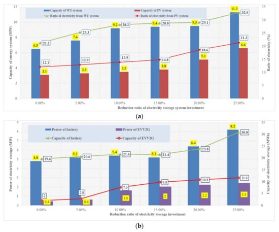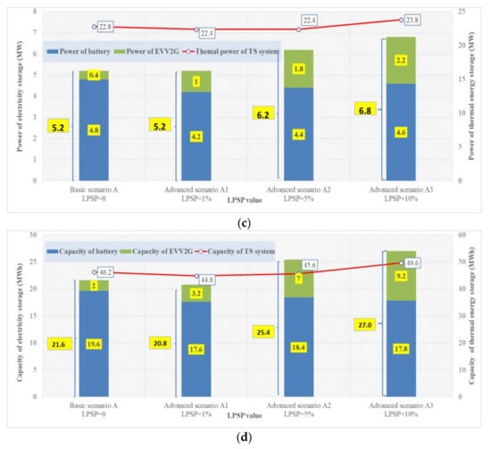 Figure 2c,d. The main contributor to the increment is the growing size of EVV2G. The size of EVV2G increases from 0.4 MW/2.0 MWh to 2.2 MW/9.2 MWh. As LPSP value decreases, EVV2G might be an electricity storage technology rival for the battery.