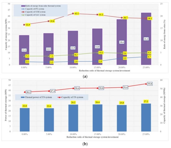 Figure 2b, it is demonstrated that more and more thermal energy demands are satisfied by solar energy when LPSP value changes from 0% to 10%. The total size of solar thermal energy systems (STH and SAC system) rises more than 27.9 percent to 51.3 MW. Additionally, the ratio of thermal energy taken by solar source maintains a stable growth, from 35.9% to 45.6%.