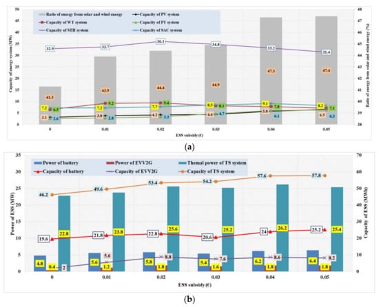 It needs to be noticed that all solar and wind power systems might have almost identical capacities when the subsidy for ESS reaches to a certain level. For the case study in Xizhou town, the certain level is optimized as 0.05 € per unit (kWh). The optimized ESS subsidy value would vary with different cases.