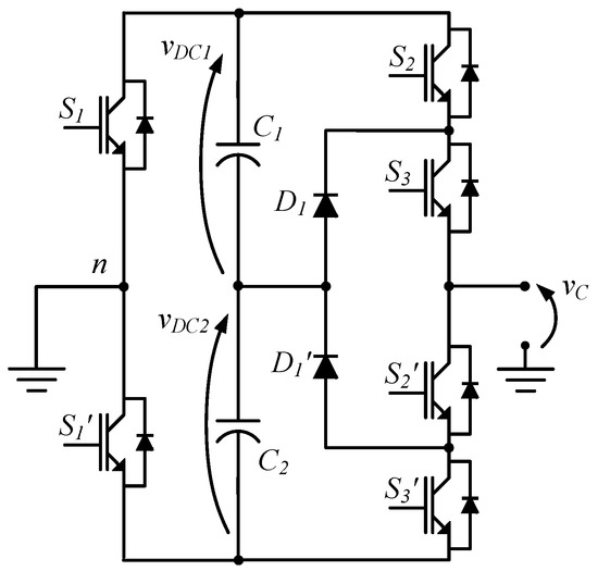 The different states that the 5-level converter can assume during the positive and negative half-cycles are presented in Table 1. This table illustrates that the semiconductors S1 and S1’ are switched at the fundamental frequency of the produced voltage, and the other semiconductors (S2, S2’, S3, and S3’) are switched to establish the different voltage levels.
