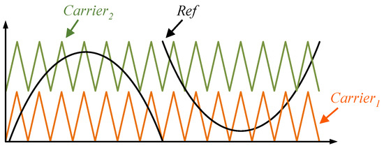 In order to produce the desired current, a modulation strategy is required to drive the IGBTs accordingly. Multilevel inverters require different SPWM arrangements than those required by two-level inverters, hence more than one triangular carrier is needed. The different carriers can be distributed either vertically or horizontally. Since the studied converter derives from the DCMLI topology, the adopted SPWM strategy is based on Phase Disposition (PD) modulation, i.e., the triangular carriers are vertically distributed and in phase with each other. However, an adaptation was performed in order to reduce the number of required triangular carriers. Hence, instead of using four carriers and a single reference signal, a single carrier and adapted reference signals are used.