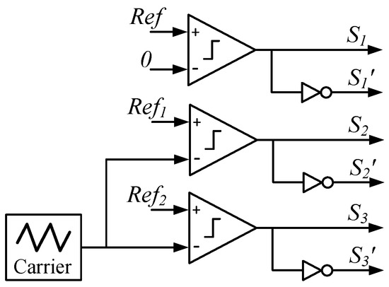 Figure 7 shows a simulation result of the implemented modulation strategy, where a sinusoidal signal was used as reference signal. As it can be seen, the reference signal is used in two comparisons, one for emulating the upper carrier (Ref2) and the other for the lower carrier (Ref1).