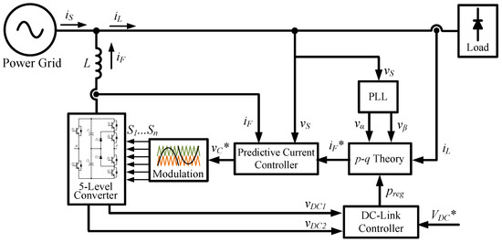 This section introduces the proposed control algorithms for the SAPF based on a 5-level converter, including a description about the p-q theory complemented by a Phase-Locked Loop (PLL) and adapted to work with single-phase installations, the DC-link control, the predictive current control, and the SPWM strategy.