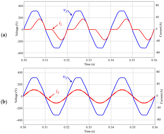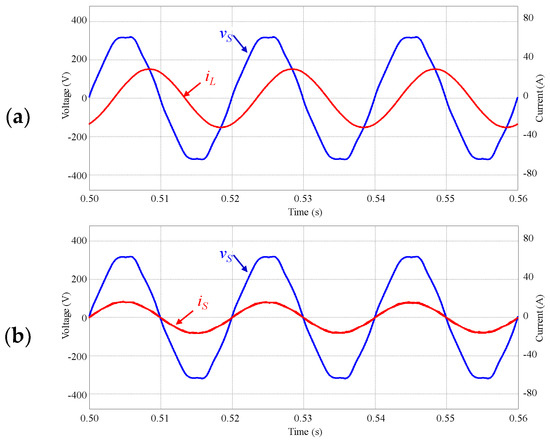 Steady-state analysis of the SAPF operation with non-linear load: (a) Source voltage (vS) and load current (iL); (b) Source voltage (vS) and source current (iS).