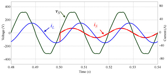 With the advances in power electronics, the number of linear loads has been reducing. However, there is still a considerable number of linear loads, such as, for example, the single-phase AC motors, which are good examples of RL loads. RL loads do not produce harmonic currents if supplied by a sinusoidal voltage, however, they produce reactive power. Since a SAPF is capable of compensating both harmonic currents and reactive power, the SAPF operation with linear loads should be considered. Therefore, a 30 mH inductor connected in series with a 7.5 Ω resistor was realized. Figure 10 depicts the source voltage (vS), which is equal to the load voltage, the current drawn by the load (iL), and the resulting source current in steady-state due to the SAPF operation (iS). As it can be seen, the displacement power factor is compensated to the unity by the SAPF operation. It is noticeable that the Root Mean Square (RMS) value of the source current decreases due to the improvement in the power factor (PF).
