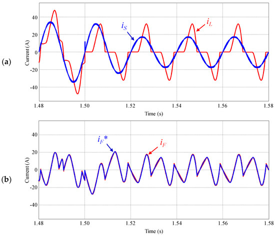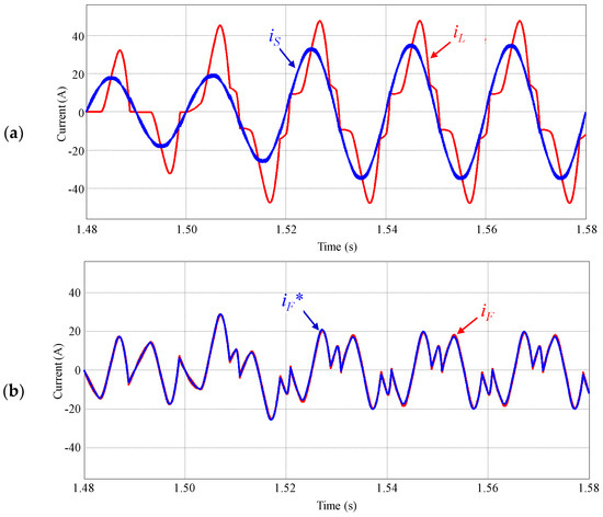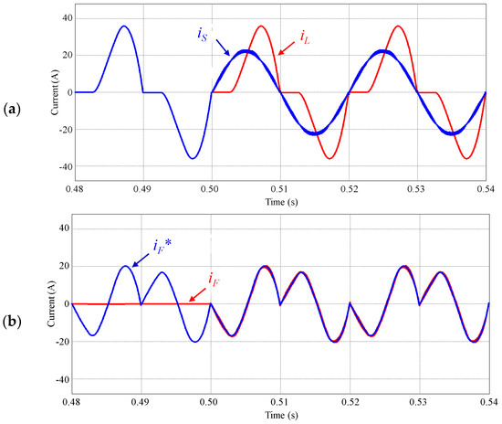 Transient analysis of the SAPF operation with the connection of a non-linear load: (a) Load (iL) and source (iS) currents; (b) SAPF reference (iF*) and actual (iF) compensation current.