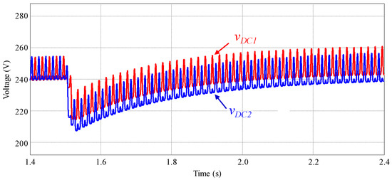 Transient analysis of the SAPF DC-link voltages (vDC1 and vDC2) during the connection of a non-linear load.