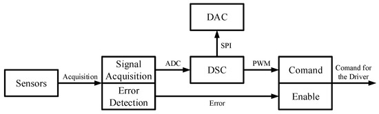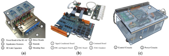 Figure 18b shows the boards responsible for the control system, from the acquisition of the voltage and current sensors signals to the generation of the PWM pulses that are applied to the gate driver boards described above. A block diagram of the control system is shown in Figure 19. This system consists of the block of sensors, followed by the block responsible for the signal conditioning and conversion of the analog signals to digital, through an Analog-to-Digital Converter (ADC). This block also contains a comparator circuit, used to detect if there exist values outside of the stipulated limits. The values converted by the ADC are made available to the DSC, where all the control algorithms were implemented. The DAC board connected to the DSC through a serial SPI communication allows a real-time visualization of the variables calculated by the control algorithms. Finally, the control block converts the PWM signals from the 3.3 V Transistor-Transistor Logic (TTL) to the 15 V Complementary Metal-Oxide Semiconductor (CMOS) logic used by the gate driver boards. This block also receives error signals, suspending the switching of all IGBTs in case any error is detected.