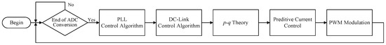 The signal conditioning board, previously presented in Figure 18b, is responsible to convert the analog signals into digital signals in order to enable the DSC to process the values acquired from the sensors. Although the DSC used in this project has an internal ADC, it presents some limitations. For this reason, a board with an external ADC was implemented. This ADC, manufactured by MAXIM with the reference MAX1320, can read 8 channels with bipolar input of ±5 V with a resolution of 14 bits. All the digital control algorithms of the system were implemented in the DSC, whereby in this work it is used the TMS320F28335 manufactured by Texas Instruments (Dallas, TX, USA). It is a platform with typical instructions of a Digital Signal Processor and with a set of peripherals typical of a microcontroller. This DSC has a 32-bit processor with a clock frequency up to 150 MHz with native support for floating-point operations, 16 channels of 12-bit ADC and 18 PWM channels. One important characteristic of the PWM module included in the DSC is the possibility to introduce a dead-time between the two complementary IGBTs of the converter leg, avoiding the existence of short circuits during the switching. Figure 20 shows a flowchart with the sequence of processes implemented in the DSC to perform the control system. After the peripheral configurations and variables initialization, the DSC enters in an infinite loop. There is a timer interrupt routine responsible to trigger the ADC start at every 25 μs resulting in a frequency of acquisition of 40 kHz. After the conclusion of the ADC conversion, it is implemented the routine responsible for the PLL algorithm, followed by the DC-link voltage control to calculate the required inputs of the p-q theory. The p-q theory routine determines the compensation current that is processed by the predictive current routine and, subsequently, by the SPWM strategy to determine the gate signals applied to the DSC PWM peripherals.