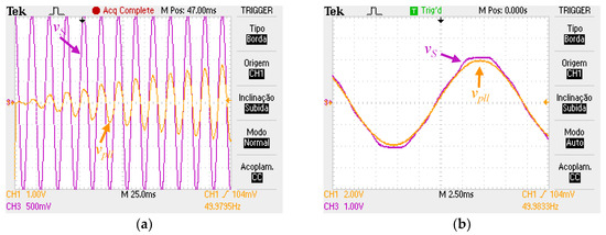 The preliminary tests began with the synchronization of the SAPF with the power grid. For this purpose, it was used a PLL algorithm responsible to detect the fundamental component of the source voltage. Figure 21a shows the source voltage (vS) and the PLL signal (vpll) calculated by the algorithm during the system connection. As it can be seen, the PLL algorithm quickly acquires the phase of vS, being the amplitude value achieved in a few grid-cycles. After the synchronization transient, the PLL signal (vpll) perfectly matches the fundamental component of vS as it can be seen in Figure 21b.