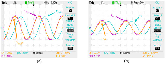 In this section are presented the experimental results from the p-q theory calculation. In the computer simulations, when implementing the p-q theory, the source voltage (vS) and the load current (iS) were used as the α coordinate, and a delay loop of 270° was implemented to obtain the β coordinate. However, in the experimental implementation, in order to increase the performance and save the DSC resources, it was chosen to keep the β coordinate as the original signal and delay the signals 90° to obtain the α coordinate. Subsequently, it is calculated the compensation current from the β coordinate current (iβ). The experimental implementation of the p-q theory algorithm applied to a single-phase installation is presented in Figure 22a shows the source voltage (vS) and the signals vα and vβ generated by the PLL algorithm. Figure 22b shows the current (iL) from a resistive load, as well as the generated signals iα and iβ. As previously mentioned, the phase shift between iα and iβ is achieved by the storage of the acquired current values into an array and posterior reading of the values with a 90° delay. In both cases, it is possible to see that the α coordinate has a delay of 90° related with the β coordinate.