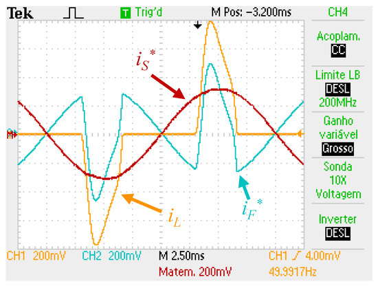 In order to test the p-q theory algorithms with non-linear loads, it was used a full-bridge diode rectifier with a resistor and a capacitor connected in parallel in the DC-side to calculate the compensation current and the theoretical value for the source current after compensation. Figure 23 shows the load current (iL), the compensation current calculated from the p-q theory (iF*), and the theoretical source current after the compensation (iS*). It can be seen that the theoretical source current (iS*), results from the difference between iF* with iL. Additionally, it can be seen that iS* is perfectly sinusoidal, validating the implemented p-q theory control algorithm.