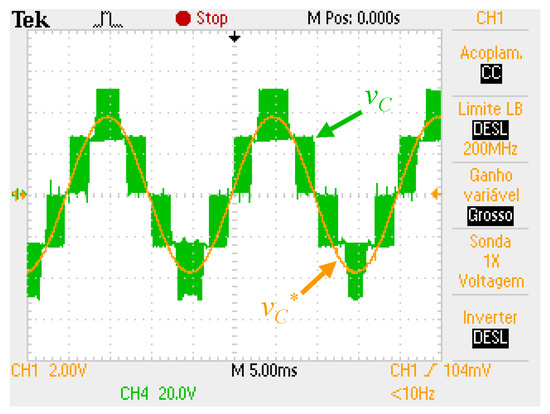 With the purpose of validating the modulation technique, it was used a sinusoidal waveform with 50 Hz as the reference to the modulation technique. In Figure 24, it is possible to see the voltage generated by the 5-level converter, as well as the sinusoidal reference. In this figure, the 5-levels generated by the power converter following the reference signal are clearly identifiable. For this experimental test, the 5-level converter was tested in open loop, with a DC power supply connected to the DC-link.