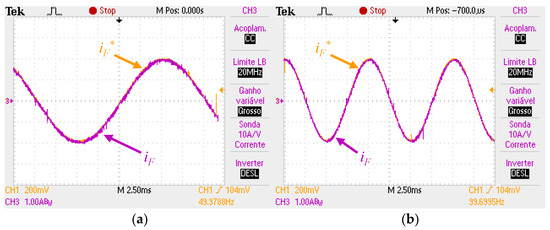 In order to test the predictive current control technique, it was used a resistive load in the output of the SAPF. With that, and once the 5-level converter is not connected to the power grid, the equation of the current control previously referred undergoes a slight change. In this way, the output voltage of the 5-level converter will correspond to the voltage in the output resistive load. During this test, the DC-link of the power converter is fed by two DC power supplies. In Figure 25 are presented the experimental results obtained with the predictive current control producing a sinusoidal current with 2 A of amplitude. Firstly, it was used a reference current with 50 Hz (Figure 25a), and in a second test was used a frequency equal to 100 Hz (Figure 25b). As it is possible to see in the figures, the filter current perfectly follows the references with a low switching ripple.