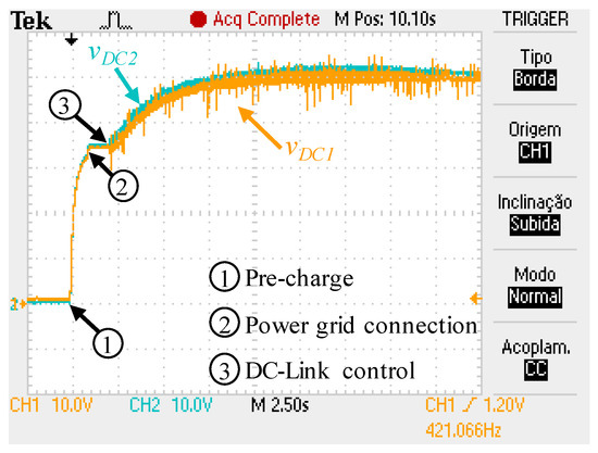 For a proper operation of the SAPF, the voltage on the DC-link should be slightly higher than the source peak voltage. To prevent a high peak current during the connection of the SAPF with the power grid, the pre-charge system described in the Section 5 needs to be operated correctly. As it can be seen in Figure 26, before the tests, the DC-link capacitors are fully discharged. When the SAPF is connected with the power grid, with the pre-charge system, at the time instant 1, the DC-link voltages start to increase until the peak value of the power grid voltage, approximately 70 V (35 V in each capacitor) and then at instant 2 the bypass contact is activated. A few seconds after, at time instant 3, the DC-link voltage control algorithm was enabled, starting to regulate the DC-link voltage to the reference value of 100 V (50 V in each capacitor). As it can be seen in the figure, the DC-link voltages converge to the reference value without any visible overshoot and maintaining the two voltages balanced, proving that the DC-link voltage control algorithm operates properly.