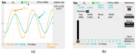 After validating the DC-link voltage control algorithm, the operation the SAPF was firstly tested with a linear load composed by a resistor in series with an inductor (RL load). The load current (iL) and the source voltage (vS) of the single-phase system are shown in Figure 27. In Figure 27a it is possible to see that iL and vS have a phase-shift of 42°, resulting in a PF of 0.74. Figure 27b is represented the harmonic spectrum of the load current, where it is possible to verify a THD of 2.5% and an RMS value of 6.4 A.