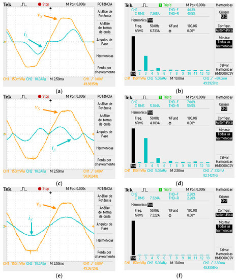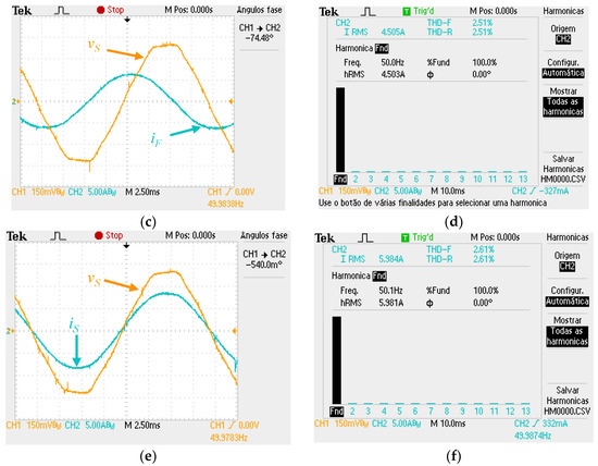 In Figure 28c, it is visible the compensation current produced by the SAPF (iF), as well as the harmonic spectrum in Figure 28d. Once again, and as desired, after the compensation the source current becomes sinusoidal and in phase with source voltage, as shown in Figure 28e. In Figure 28f, it is possible to verify that the THD of the current is reduced to a value of 2.2%. Table 3 presents the main indicators of the experimental results achieved with the SAPF. As it is possible to see, in both test cases, the RMS values of the source current are lower than the RMS values of the load currents. However, the benefits of the SAPF are more visible in terms of current harmonics and reactive power compensation. In both test cases the PF of the installation becomes almost unitary and in the case of the non-linear load, the THD is reduced from 44.3 to 2.2%.