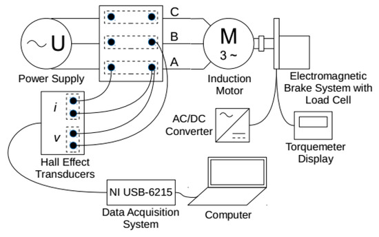 The efficiency of an electrical motor is computed as the ratio of the shaft power to the electrical power [5]. The electrical power is the input power related to the electrical motor supply. This power can be easily calculated from the voltage and current data. In the process of converting electrical to mechanical power, there are different types of losses. Thus, the shaft power is the output power, which is the mechanical power available on the motor shaft. The shaft power depends on the shaft torque and the rotor speed measurements. However, a robust and reliable torque meter is expensive, and its installation may not be possible for some in-service machines. Besides, these devices can require appropriate calibration and maintenance [2,6].