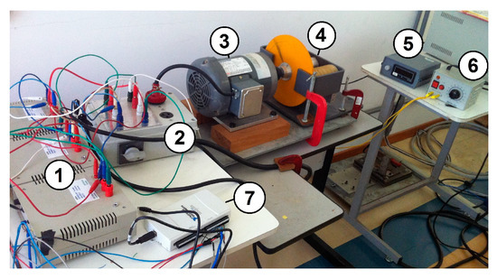 Figure 4 presents a photo of the laboratory setup used for the experimental tests, whose items are (1) the voltage and current Hall effect transducers boxes, (2) the box for electrical connections, (3) the induction motor, (4) the electromagnetic brake system with a load cell, (5) the display for torque indication, (6) the AC/DC converter to supply the brake system, and (7) the data acquisition system.