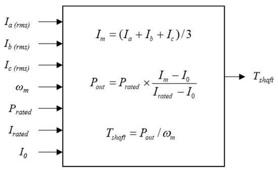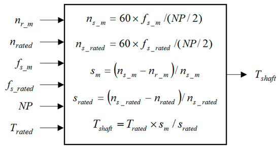 where Prated is the rated shaft power; Pshaft is the current operation shaft power, Im is the measured current; Irated is the rated current, and I0 is the no-load current.